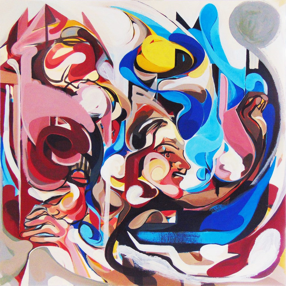 This contemporary abstract acrylic painting, created in 2015, blends bold tones of red, blue, yellow, and pink with fluid, organic lines that intertwine in energetic compositions. Figures appear semi-recognizable within the abstract forms, creating a dialogue between figurative and non-figurative art.