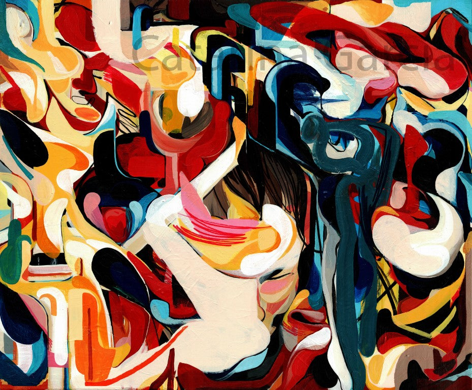 This vibrant contemporary painting (50 x 70 cm, acrylic on canvas) captures the energy of movement and emotion through bold color contrasts and layered abstract forms. Painted intuitively, the composition blends organic shapes, flowing gestures, and dynamic brushwork, creating a powerful visual rhythm.